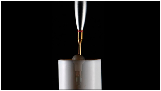 Teflon tape was used to seal the screw hole. Then, the MZRs were bonded to the TBA using PANAVIA SA resin cement (SA Cement Universal, Kuraray Noritake). An oxygen-inhibiting gel (Oxyguard II gel, Kuraray Noritake, Milan, Italy) was used to enable complete curing. Initially, a quick cure of 5 s was performed (Valo, Ultradent, Salt Lake City, UT, USA). After excess cement removal, the samples were put in a dental laboratory curing light and polymerized for 5 min. Finally, the samples were cleaned and polished (Figure 2). Forty-eight hours later, the samples were debonded according to the experimental protocol reported in Table 4 and as previously published [23].