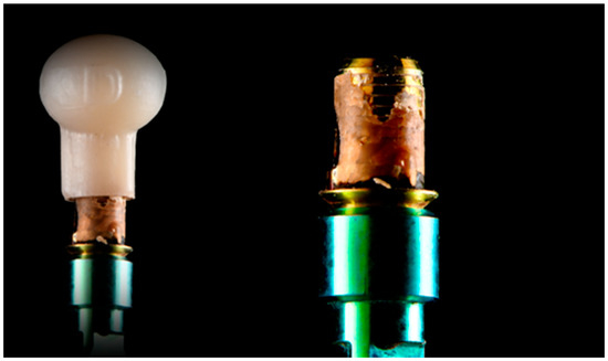 After the debonding procedure, all the MZRs and TBAs were visually inspected with a stereomicroscope. All the samples were debonded according to the aforementioned protocol. Then, all the MZRs were found to be free of complications, such as fractures or crack lines, independently of the shapes. Figure 5 shows a general view of the two TBAs—on the left side, the part is in an initial condition, and the right side shows the TBAs after the described procedures. The color difference between these two can be easily spotted. The initial condition maintains the typical outlook of the titanium, while the second became yellow. This is an expected outcome, as, during the heat exposure at 370 °C, an oxide layer is created on the titanium surface.