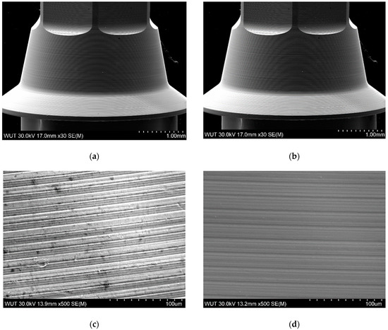 Anodized (a,c) and control (b,d) TBAs at 85× (a,b) and 300× (c,d). The black spot in Figure 7d is related to the electric charge in the dust on the specimen’s surface.
