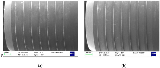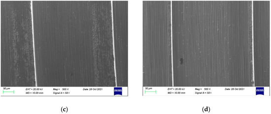 As no damages were found under stereomicroscopic analysis, the samples proceeded directly to the SEM inspection. More details can be found in the SEM images presented in Figure 6a–d. A conical part of the TBAs is compared in Figure 6a,b. As can be noticed, the contrast on the part after the thermal exposure is visibly less prominent, which may be related to a lower conductivity of the specimen or the presence of a very thin layer, which can hinder the escape of secondary electrons during observations. Both features can be linked to the presence of an oxide layer established during the thermal exposure of TBA. Higher magnification of the TBA in its initial condition reveals the patterns from the manufacturing process—the machining. The cementing and removal of the zirconia did not change those patterns, as seen in Figure 6d, but some slight changes on the surface can be noticed. Similar results were found for the anodized TBAs compared with the control and the new titanium-base abutment (Figure 7).