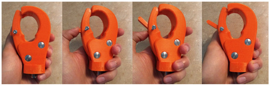 The filament chosen for the prosthetic prehensor was Prusament PC, a polycarbonate material also made by Prusa. This particular polycarbonate (PC) provides a durable, impact and temperature resistant print, that is not prone to wear (compared to other 3D print materials). It has a Shore hardness of 79D. The prototype was printed solid (full thickness) at the University of Portsmouth. The fixed jaw was printed upright (same orientation as passive hand) alongside the thumb and trigger lever which were printed on their sides (Figure 6). This required approximately 16 h to print. The internal hardware (spring, nuts, bolts) were chosen from rust and corrosion resistant materials and the device was then assembled for testing.