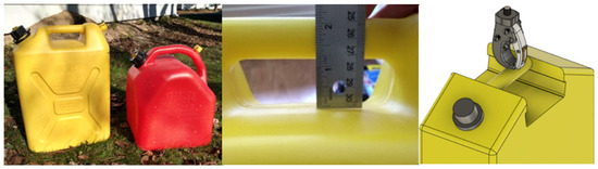 Fetching water using a 20 L military-style diesel jerry can (taller than it is wide) is very common in Uganda. Though many different styles and shapes exist around the world, the F4P team used one that resembled the handle area of the Ugandan varieties as closely as possible. This handle opening is narrower and has less space to manoeuvre the end of the prehensor into the opening. There is also a limited space underneath the device before the top of the main body. This is important to note, as when using the push-on functionality to open the prehensor, there is a forward distance that is travelled by the hooked area before the handle enters the interior. Figure 7 shows the jerry can used as the model for design.