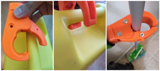 The prehensor was also tested to ensure the hooked end of the fixed jaw could withstand a loading force without experiencing failure. To test this carrying capacity, the jerry can was filled with water for a total load of 12.9 kg. The prehensor was used by a team member to grasp around the handle and lift the jerry can. It was then carried at a comfortable walking pace for approximately one minute Figure 14. It was noticed that in the first few steps, as the arm and jerry can swung, the prehensor shifted to the back of the handle as this was the most stable position. There was no further shifting of the prehensor relative to the handle afterwards which is likely due to the position internally where the water line was level.