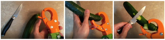 Matoke is a green fruit, indigenous to southwest Uganda, and a staple of the country’s cuisine. Though similar to a Plantain, a Matoke needs to be firmly gripped and peeled with a knife or machete. Any cylindrical fruit or vegetable is often peeled by holding it within the terminal device, peeling a section, releasing and rotating the fruit, and peeling another section. The task is made difficult because there is limited regulation possible by the user of the gripping force which would provide the counter force to the peeling direction when the knife is drawn towards the body. Creating a counter force is necessary for stability during peeling. For this reason, a cylindrical depression was designed into the fixed jaw where the end of the fruit can rest, holding it stable when peeling. This is referred to as the ‘Matoke nook’. For added stability, the thickness of the jaws can be increased, but this is at the expense of less of the fruit being exposed for peeling. When a user is trained to do this task, they will be instructed to expose the trigger lever, then pick up the knife and fruit with their opposite side, in this order. Using their smallest finger, they can then pull down on the lever and insert the fruit into the nook and release and proceed to peel. This ADL is illustrated below in Figure 9 using a Zucchini.