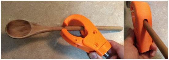 The handle of the wooden spoon is pushed through the passthrough hole in the fixed jaw. The fixed jaw and thumb tip provide the force to secure the grip.