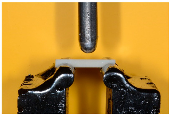 Flexural strength was determined using the three-point bending flexural test carried out using a universal testing machine (Lloyd LR30K universal testing machine, AMETEK Test & Calibration Instruments, Bognor Regis, UK) equipped with a 500 kN load cell and a crosshead speed of 1 mm/min, according to the ISO 6872 specification. For the execution of three-point bending tests, an ad hoc support (Figure 1) was designed and realized, following the specifications suggested by ISO6872: 5 mm diameters rollers, an inter-support distance greater than at least 10 times the thickness of the sample and a spherical head-loading piston with a diameter of 5 mm. Before the execution of each test, the dimensions of individual samples were measured with a precision digital calliper with an accuracy of 0.01 mm. The average bending-strength values were calculated according to the ISO 6872, using Equation (2):