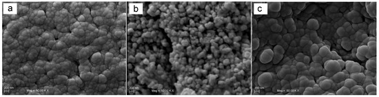 SEM images showing the micrograins of Y-TZP Groups (50,000× magnification). (a) High-translucent zirconia; (b) low-translucent zirconia; (c) high-translucent zirconia after aging.