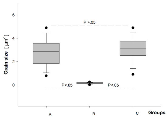 The grain size (mean ±SD) measured under SEM (Figure 2) was: for group A, 2.75 (±1.2) µm2; for group B, 0.16 (±0.05) µm2; for group C, 3.04 (±1.1) µm2. The statistical evaluation showed a significant difference between groups A and C versus B (p < 0.05), while no statistically significant difference was present between groups A and C (before and after aging) (Figure 3).
