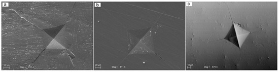 SEM images of the Vickers indentations during the microhardness test. The dimension of the indentation determined the hardness, while the course and the length of the generated microcracks at the angles of the indentations were used to evaluate the fracture toughness. (a) High-translucent zirconia; (b) low-translucent zirconia; (c) high-translucent zirconia after aging.