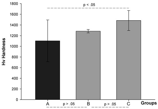 The Hv (mean ± SD) values for different groups were: 1102 ± 392 MPa for group A, 1284 ± 32 MPa for group B, and 1483 ± 187 for group C (Figure 4). The Hv was significantly increased in the group of “aged” zirconia (group C) samples compared to both group A and B (p = 0.002). Meanwhile, there was no statistically significant difference between group B and A (p > 0.05) (Figure 5).