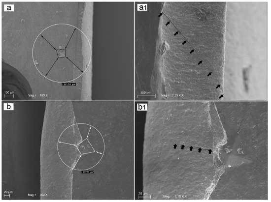 SEM images showing: (a) fracture and microcrack development at 193× magnification in group A. The surface area of the material involved by the four crack lines was 301 mm2; (a1) at higher magnification (1230×), the fracture propagation appears to involve the entire thickness of the specimen; (b) fracture and microcrack development at 552× magnification in group B. The surface area involved by the four crack lines was 23 mm2; (b1) at higher magnification (1190×), the fracture propagation appears to partially involve the specimen thickness.