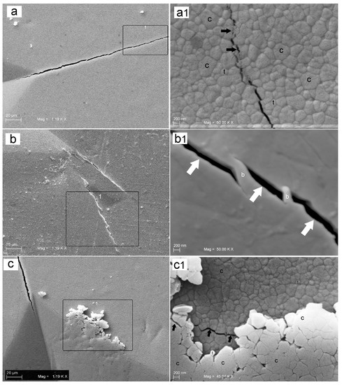 SEM images showing the microcrack propagation; (a) group A at low magnification (1190×). The rectangle delimits the area reported in a1; (a1) at higher magnification (50,000×), the relationship between grains and microcracks appears. The black arrows indicate a trans-granular fracture near the crack tip. It is also possible to recognize cubic grains (C) and tetragonal grains (t) on the basis of their dimensions. (b) Group B at low magnification (1190×). The rectangle delimits the area reported in (b1); (b1) at higher magnification (50,000×), the “bridging” phenomena (b) along the margins of microcracks (white arrows) highlight the effects that tend to close the fracture line, since the conventional zirconia undergoes a phase shift (tetragonal vs. monoclinic structure) with a crack tip closure phenomenon; (c) group C at low magnification (1190×). The rectangle delimits the area reported in (c1); (c1) at higher magnification (50,000×), a different relationship between grains and microcracks appears after the aging process. The black arrows indicate an intergranular fracture development (at grain boundaries) that shows a faster microcrack propagation. It is also possible to recognize cubic grains (C) and tetragonal grains (t) on the basis of their dimensions.