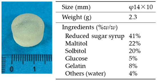 The test food (GLUCOLUMN, GC, Tokyo, Japan) was gummy jelly containing 5% glucose, with a cylindrical shape of 14 mm in diameter and 10 mm in height and weighing approximately 2 g. The other constituents of the gummy jelly were 41% reduced sugar syrup, 22% maltitol, 20% sorbitol, and 8% gelatin [32] (Figure 1).