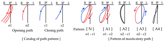 For 10 cycles from the fifth to the fourteenth cycle after the start of mastication, the movement paths were superimposed, and the average path was displayed. The masticatory movement path patterns were classified into one of five types: N (Normal pattern) and A1 to A4 (Abnormal pattern) including four patterns consisting of a combination of two types for the opening path (o1: straight or concave, o2: convex) and two types for the closing path (c1: straight or convex, c2: concave) (N: o1–c1, A1: o1–c2, A2: o2–c1, A3: o2–c2), and a pattern (A4) in which the opening and closing crossed [48] (Figure 2).