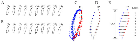 Method used to calculate average path, opening distance (OD), and masticatory width (example of participant 1). (A) 5–14 cycles on the right side chewing. (B) The coordinates for each cycle are determined by vertical division into 10 equally spaced sections. (C) Overlapping of each cycle and average path. IP: intercuspal position. (D) Average path and standard deviations of each level. (E) OD and width from the first to the ninth level.