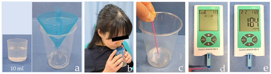 Participants were asked to chew the test food on one side for 20 s without swallowing. After chewing, they were asked to hold 10 mL of water in their mouth for a moment and to spit into a cup with a filter. The glucose concentration of the filtrate was measured using a glucose-measuring device (GS-2, GC, Tokyo, Japan). The measured value was taken as a parameter of masticatory performance (Figure 4) [32]. It has been confirmed that the effect of saliva on the measurement results is less than 5% when holding 10 mL of water and spitting with the gummy jelly [60].