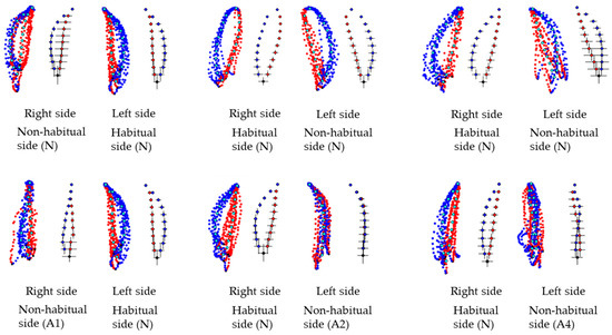 Regarding the movement path pattern, it has been reported that there are many nor-mal patterns in healthy adults [48], and many abnormal patterns in adults with malocclusion; however, they recover to normal patterns after treatment [43], and abnormal pat-terns appear when experimental occlusal interference is applied to healthy adults [49]. In this study, most of the participants had a normal pattern on the habitual chewing side; however, a relatively more abnormal pattern was observed on the non-habitual chewing side. Based on research reports on malocclusion and experimental occlusal interference, it is highly likely that some occlusal abnormality exists on the non-habitual chewing side. Therefore, it can be said that there is a need for inspection of occlusion on the non-habitual chewing side and further occlusal adjustment.