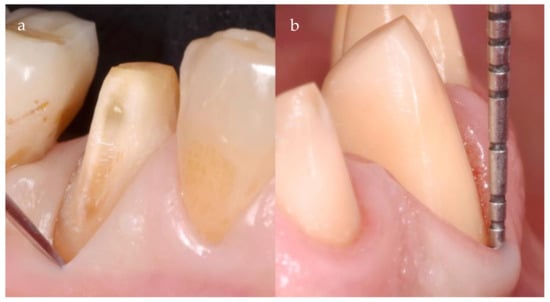 The root surface whose periodontal attachment is lost consists of necrotic cement and dentin; these tissues are exposed to pathogens and could be compromised by toxins and bacteria. Preparing these parts of the tooth helps protect the dental tissues from the oral environment and eliminates the external and more compromised part of the root []. This procedure is possible only on teeth with a loss of periodontal attachment, as performing it on a periodontally intact tooth would result in periodontal damage. It is essential to underline that the loss of periodontal attachment is not a synonym of active periodontitis, which is a contraindication for prosthetic treatments []. Still, it refers to all those teeth which have lost support in the past without active disease in the present, a widespread occurrence in the adult population []. Subgingival preparations with diamond burs clearly create periodontal damage, which have been shown to increase periodontal inflammation indexes temporarily []. However, it is well-known from the classic literature that the periodontal tissues wounded during tooth preparation will ultimately recover if left to heal undisturbed [,]. The VEP technique, therefore, requires the provisional crown margins to be left coronally to the gingival margin so that they cannot interfere with the periodontal healing.