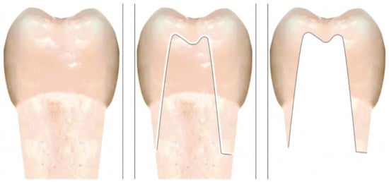 - Rosner, D. Function, placement, and reproduction of bevels for gold castings. J. Prosthet. Dent. 1963, 13, 1160–1166. [Google Scholar] [CrossRef]