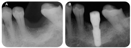 A 69-year-old female patient visited the dental clinic of Daegu Catholic University Medical Center to restore a missing mandibular left first molar and second molar (Figure 8A). The patient had a medical history of mild diabetes and hypertension, but she was not taking any medications which needed to be discontinued during the implant procedure. The patient was a non-smoker. Through consultation with the patient, it was decided that two implants would be placed. As a surgical method, flap operation was planned for vertical and horizontal bone grafting and implant placement. After the intraoral and radiological examination of the patient, scaling was performed before implant placement. The patient received the same pharmacologic protocol of the patient of case 1. A 4.5 × 10.0 mm and a 5.0 × 8.5 mm implant (AR fixture; Biotem, Seongnam, Republic of Korea) were placed, respectively (Figure 8B). Each implant was placed with the proper initial fixation torque of 30 N/cm2. After a sufficient healing period of 3 months, it was decided the prosthetic treatment procedure would commence.