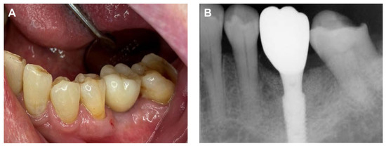 Final delivery of implant prosthesis. (A) Intraoral photograph, (B) Periapical radiograph.