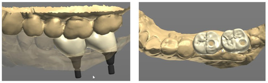 Next, the same laboratory process described in case 1 was performed. The prosthesis was designed on the CAD software, and a prefabricated link was selected through the scan data obtained from the model scan (Figure 10). A final prosthesis was obtained by milling zirconia through a CAM milling machine. A prefabricated substructure (link) (Toplan Co., Seoul, Republic of Korea) was fitted to the final prosthesis through frictional force.