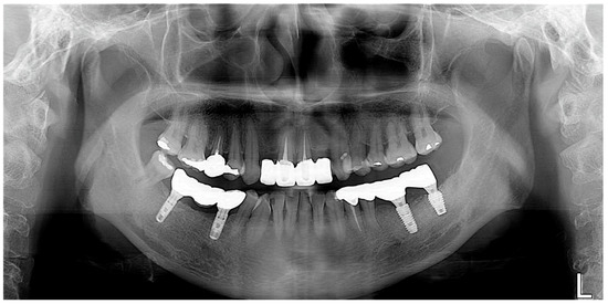 As part of a maintenance therapy program for the patient, a follow-up examination was performed every 6 months and the patient underwent dental plaque control. Additional periodontal treatment was performed when necessary in additional appointments. In addition, panoramic radiographs were taken every year to evaluate the prognosis of the implant. A 3-year follow-up examination showed successful maintenance of the implant prosthesis in the oral cavity (Figure 7).
