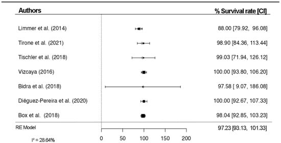 Meta-analysis was performed for the variable survival rate (%), applying as a specific continuous moderator to the follow-up of the patients. The heterogeneity of the data (I2) was evaluated. If between 0% and 40%, there was no heterogeneity. Between 40% and 60%, there was moderate heterogeneity. Between 60% and 80%, there was substantial heterogeneity. Between 80% and 100%, there was high heterogeneity. A funnel plot was drawn to verify heterogeneity and whether studies were within the confidence interval (95%) [24].