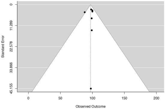 The quality assessment showed (Table 4) that the articles included in this systematic review had values greater than 70%, considered high quality. The forest plot (Figure 2) and funnel plot (Figure 3) showed low heterogeneity among the studies. The largest variation in the confidence interval was observed in Bidra et al.’s study [16], which may be due to the number of prostheses initially evaluated. However, the heterogeneity found was I2 = 28.64%, which represented a low level of heterogeneity. The average survival rate in the studies was 97.23%.