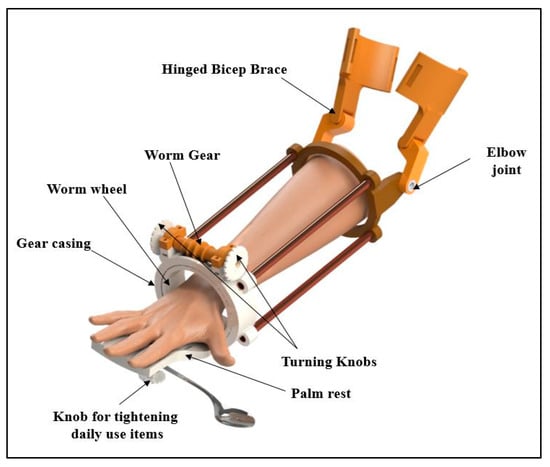 The palm rest and the worm wheel were coalesced into a single component to simplify the manufacturing and assembly processes (Figure 3). A slot with a screwed-in knob was provided under the palm rest to accommodate the interchangeability of different items of daily use, such as a toothbrush, comb, spoon, etc., as per an individual’s requirement.