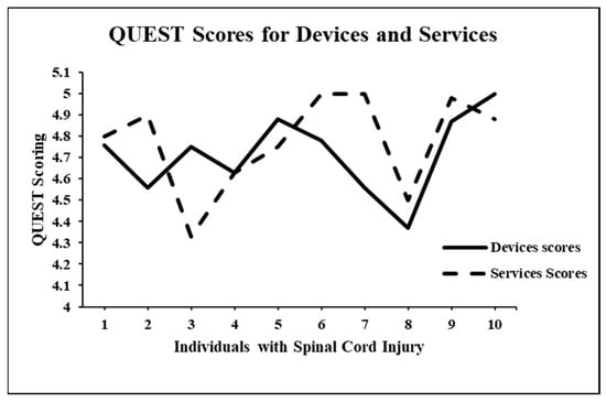 The results of the study were evaluated via the use of the QUEST questionnaire [23]. As per the subdivision of the QUEST scale, the results obtained for the QUEST devices score were 4.71 ± 0.17 and the results obtained from the QUEST services score were 4.77 ± 0.21. The QUEST total result obtained was 4.74 ± 0.15. The results obtained for the satisfactory performance of the multipurpose customized orthosis from the QUEST measure indicated its range as being between a score of 4, i.e., quite satisfactory, and a score of 5, i.e., very satisfactory. Figure 4 illustrates the QUEST scoring obtained in the study.