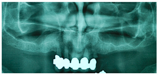 Intra-oral and extra-oral pictures together with analogic impressions and radiographic images were obtained in order to develop a treatment plan. Extra-oral examination did not reveal any asymmetry; however, oral inspection highlighted an oblique occlusal plane with centripetal atrophy of the alveolar crest on posterior maxillary sites. Radiographic exams (orthopantomography and cone beam computed tomography) revealed severely pneumatized maxillary sinuses, which ruled out conventional implant placement in the posterior sites (Figure 2). After the extractions were performed, the residual bone volume was suitable for implant-supported rehabilitation, either fixed (fixed dental prosthesis—FDP) or removable (overdenture).