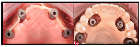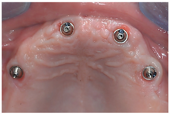 In light of the above, two straight and two tilted implants (4 × 12.5 mm) (Spi Contact Inicell, Thommen Medical; Grechen, Switzerland) were inserted in order to comply with the All-on-4 rehabilitation protocol. Multi-unit abutments (MUAs) were screwed onto the implants as intermediate components to provide passivation for the metal superstructure (Figure 3) [16].