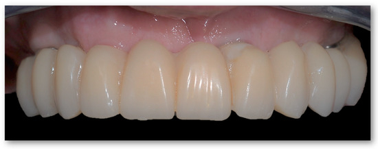 The one-model technique described by Biscaro et al. was used to transfer the implant position onto the previously articulated models [17]. An experienced technician (MO) manufactured the metal superstructure and modeled the teeth anatomy with acrylic resin according to aesthetic and occlusal requests (Figure 4). Immediate loading was performed within 48 h.
