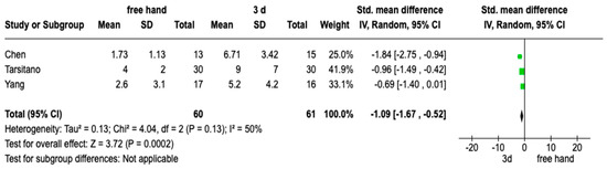 The meta-analysis was conducted by a random model effect because of the high heterogeneity (I2 = 50%) between the three included studies. For the meta-analysis, the intergonial distances between study groups and control groups were considered as common parameters, and therefore, of the seven selected RCTs, only three have these parameters in common in order to conduct a meta-analysis. The overall impact reported in the forest plot (Figure 2) shows that the 3d model technique is an excellent aid for treating maxillary and jaw reconstruction (OR: −1.09; 95% CI: −1.67, −0.52; Z: 3.72; p = 0.0002).