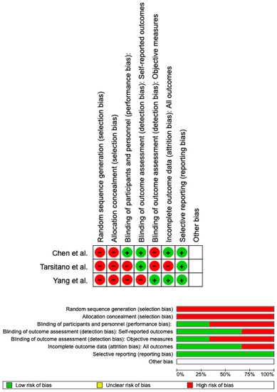 The risk of bias was calculated using RoB 2 and displayed in Figure 3. A low risk of bias was guaranteed with respect to the randomization procedure in all of the studies. Although all the studies included in the analysis properly removed bias in the choice of reported outcomes, only 25% of the studies excluded bias in self-reported outcomes. However, all studies included in the analysis reported full outcome data. Overall, it was determined that there was little chance of prejudice for all three.