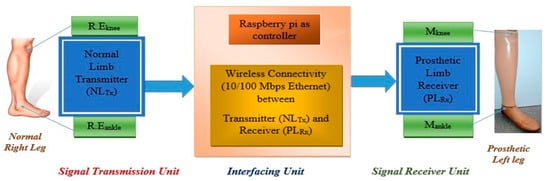People who have undergone amputations and have one normal lower limb can control the synchronized movement of a prosthetic leg attached to the residual part of the amputated limb to experience normal walking pattern. According to the range of motion of a normal leg, an artificial leg moves as per the prosthetic arrangement to provide a humanoid stride for motion. The hardware design of the artificial system includes the movement signal acquired from the existing limb of a person with an amputation to replicate the leg movement. The total constructional design works as a humanoid robotic leg with a prosthetic attachment and rehabilitation features for people with transtibial amputations. The full setup is controlled by networking and programming logic to obtain a balanced and symmetrical walking style. A person with a unilateral transtibial amputation can retrieve their previous capability to walk with a rehabilitation process. A controller-based exoskeleton design operation is described for the clinical outcome for people who have undergone amputation [1]. Single actuator-powered lower limb prosthesis design with kinematics is described in [2]. An elaborate review work is presented regarding system design of lower extremity prosthetic system in [3]. Recent advancements to lower limb exoskeleton design are considered in [4]. The mechanical human motion with functionality is described in [5]. The robotic motion planning, control and mechanics have been described in [6]. Lower limb joint prosthesis-oriented design has been shown in [7]. Rehabilitation related to the bounded control method for joint movements has been presented in [8]. A power-assisted active interface has been presented in [9]. Artificial human ankle movement has been implemented in [10]. A review of lower limb rehabilitation design has been presented in [11]. Leg motion experiments with knee flexion analysis have been performed in [12]. Joint rehabilitation-oriented lower limb design has been implemented in [13,14]. Human movement data acquisition was performed in [15,16]. In the recent research, prosthetic system design for people with transtibial amputations has been presented with mechanical structure [17,18]. The most unexplored part is electronic system design for gait synchronization between the normal limb and the prosthetic limb with body gesture. Until now, mechanical exoskeletons and prosthetic models have been designed for people with lower limb amputations to be capable of performing the daily tasks. The gait synchronization of the artificial limb with and the healthy limb utilizing kinesiological analysis is the goal of the current work alongwith the natural body movement. According to the gait pattern of the normal limb of a person with an amputation, the artificial limb’s movement is the main unexplored job for forward movement process. The Range of Motion (RoM) implementation with proper functionality for the unilateral transtibial amputated leg is a matter that has not been executed in previous research works until now. The theory of Lyapunov stability is a standard theory for non-linear systems and one of the most important mathematical tools in the analysis of non-linear systems in robotic design [19] which has been applied in the present work.