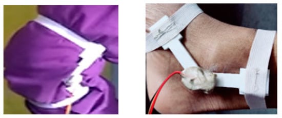 In Figure 1, the schematic diagram of a gait-synchronized artificial limb design process is presented [21]. Initially, the output voltages of the joints (knee and ankle) in the normal leg were acquired using rotary encoders. The rotary encoders were attached at the knee and ankle joints to observe the angular movement value during motion, as shown in Figure 2. The data were recorded for different muscular activities related to lower limb movement for a complete gait cycle [22]. Motor movements for an artificial limb were processed using the different angular movements during gait, replicating those of the normal leg. Mobility with synchronization in walking patterns is a novelty of this work.