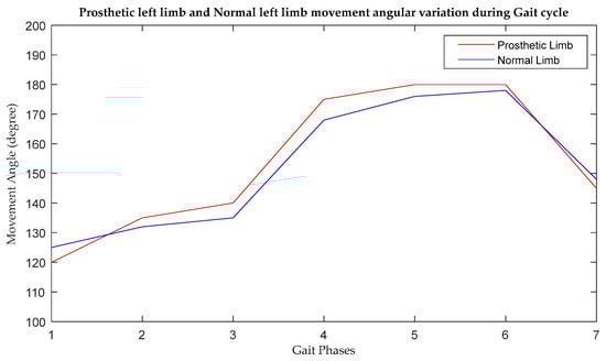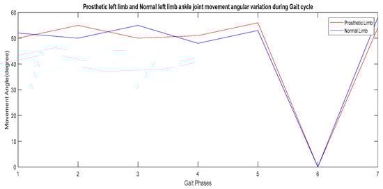The knee and ankle joint movements of the prosthetic limb show a balanced condition during walking or the steps in a single gait cycle. In each and every step, the angular motion and output voltage values were compared with the normal limb’s movement to represent the difference. For all the gait phases, the voltage deviation was much less, such as below 0.5.