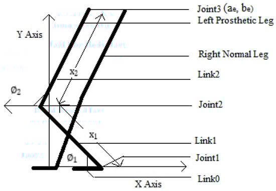 Measurements were acquired from the lower limb utilizing standard measuring apparatuses such as a ruler and a goniometer to measure the angular variation considering a schematic structure of a normal and prosthetic lower limb system, as shown in Figure 6. In this schematic diagram, a human lower limb is shown. Three joints and three links are presented in the diagram. The first (joint 1), second (joint 2) and third joints (joint 3) represent the ankle joint, the knee joint and the hip joint, respectively. The hip joint is connected to the upper half of the body. The first link (link 0) represents the feet, the second link (link 1) represents the lower half of the leg and the third link (link 2) represents the upper half of the leg. The coordinate [6] of the hip joint is () and the joint displacements in angular forms are , as given by the kinematic [7,8] Equations (1) and (2), as given below.