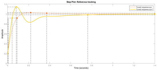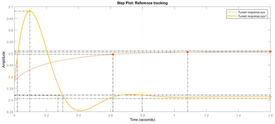 The system stability improvement was performed through a PIDF2 controller. In Figure 8, the output of the normal limb compared with that of the designed prosthetic limb, where the normal limb system is mentioned as sys with a red line and the prosthetic limb system is mentioned as sys1 with a yellow line.