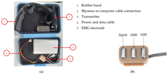 The Myomes sensor kit used in this study is presented in Figure 1a. 1. EMG electrode (label number 5) is attached to the patient’s skin using a rubber band (label number 1). The extended cable (label number 4) is added to the sensor when necessary. The signal recording and communication with the computer is carried out using a cable (label number 2), transmitter is used to transmit the EMG signal (label number 3), and EMG electrode presented in Figure 1b.