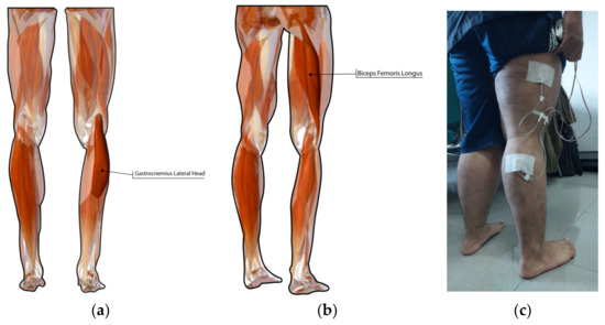 A myomes electrode was attached on the gastrocnemius lateral head and biceps femoris longus muscle, as presented in Figure 2a,b, using a hypafix, as illustrated in Figure 2c. Electrode placement was based on the suggestion of surface electromyography for the non-invasive assessment of muscles (SENIAM) and the results presented in the previous study [25]. The authors in [25] reported that the signal quality and global muscle classification is excellent when the EMG electrode is attached to gastrocnemius lateral head muscle and biceps femoris longus muscle.