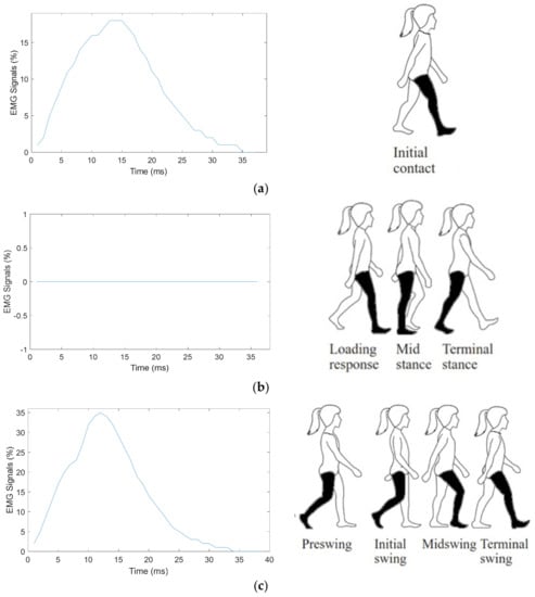 EMG signal gait partition: (a) initial contact to mid stance (initial gait), (b) terminal stance to preswing (mid−gait), and (c) initial swing to terminal swing (final gait).