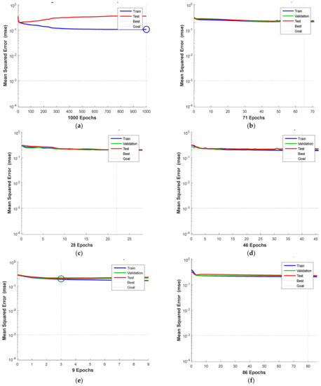 MSE value: (a) Levenberg−Marquardt backpropagation training algorithm, (b) quasi−Newton training method, (c) Bayesian regulation backpropagation training method, (d) gradient descent backpropagation, (e) gradient descent with adaptive learning rate backpropagation and (f) one-step secant backpropagation.