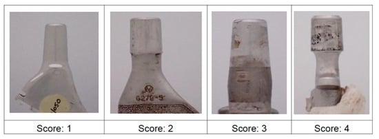 Figure 1 shows the four-level scoring method based on predefined visual parameters. These include the shape, colour, and reflectivity of the damaged areas where 1 shows no damage, 2 is mild, 3 is moderate, and 4 indicates severe corrosion damage [15]. As of today, this scoring method or modified versions have been used in many hip implant retrieval studies [12,23,24,25,26]. For instance, the modified scale of Goldberg includes an extra score between “no visible” and “mild levels of corrosion damage”. This was used in a retrieval study for grading the process of corrosion at mating surfaces: no corrosion = 0; minimal corrosion = 1; mild corrosion = 2; moderate corrosion = 3; and extensive corrosion = 4 [27]. In addition, the incidence of corrosion has been recently investigated using image processing methods in order to standardize the scoring process of implants [28,29,30].