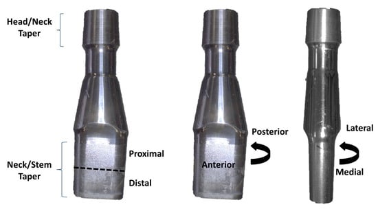 Some retrieval studies of dual-taper implants have found a correlation between the severity of fretting corrosion and other parameters such as stem size, neck-shaft angle, and neck length. Higher corrosion scores are reported in femoral stems paired with long neck lengths due to cyclic cantilever bending at the neck-stem junction in vivo. In one retrieval study [7], three implants were graded in eight independent zones. These included the proximal and distal aspects of the neck tapers, further divided into medial, lateral, anterior, and posterior regions (Figure 3). A clear pattern of increased fretting corrosion in two retrieval studies [7,40] with similar mean corrosion scores in different zones suggested the occurrence of cyclic cantilever bending at the neck-stem junction in vivo. Micromotion occurs with each step of the gait cycle. The magnitude of this bending moment increases with increasing the distance from the load axis to the taper junction. Table 4 shows the mean fretting and corrosion scores for different zones found in one study [7]. In this paper, a positive correlation between longer neck lengths (34/38 mm) and increased severity of corrosion (not fretting) on the femoral stem was reported. No correlation was found between the stem size or neck-shaft angle and fretting or corrosion of the femoral stem or modular neck. It was also suggested that variables such as the patient’s history, physical examination, laboratory studies, and imaging including plain radiographs and metal artifact reduction sequence (MARS) MRI should be considered for further retrieval analyses. This is further supported by the official recall statement issued by Stryker [73] and the algorithms for treatment of patients with a modular THR shown by Kwon et al. [74] and Pivec et al. [75]. Evidence of fretting and corrosion was reported by Kop and Swarts [58] in 6 of 16 retrieved modular hip implants (double-tapered and cone-shaped) at the neck-stem taper, with only three implants showing corrosion at the head-neck taper. The neck-stem junction showed a greater propensity for micromotion because of an increased lever arm compared to that of the head-neck junction. Similar outcomes with evidence of corrosion at the neck-stem taper and minimal damage at the head-neck taper were also reported by Gill et al. [69].