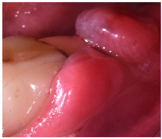 The patient said that the lower treatment was carried out 20 years ago. No verbal information nor any written details about the material, brand or nature of the inserted nails were released to the patient. Since then, she reported to have experienced complete paresthesia of the lower left lip and she affirmed that she was told by the dentist who did the treatment that it was a natural and correct consequence of the dental implant treatment. In the last years, she reported continuous episodes of abscess in different areas of the lower jaw, constant pain, and swelling. Furthermore, she had been constantly forced to ingest painkillers to manage the pain and often antibiotics. At the clinical examination, the lower prostheses seemed firm without any movement. A neoformation in the area of the first left lower molar was noticed (Figure 3) and described as follows: 5 × 3 mm red mandibular gingival exophytic neoformation in contiguous relationship with implant-prosthetic elements III posterior quadrant. Pain symptoms reported by the patient.