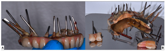 Based on the different inclinations of the nails, the prosthesis was separated between the first premolar and the canine at the right aspect of the prosthesis. After the procedure, the right side of the prostheses was easily extracted with the corresponding nails using the crown and bridge extractor (bridge and crown extractor, Bader, Porto do Molle Rúa Madanela, 36350 Nigrán, Spain) (Figure 4A). Due to some residual resistance in the left nails, a second division with burs was made between the molar and second premolar. The residual prosthesis was then removed and all the 18 pins were extracted (Figure 4B).