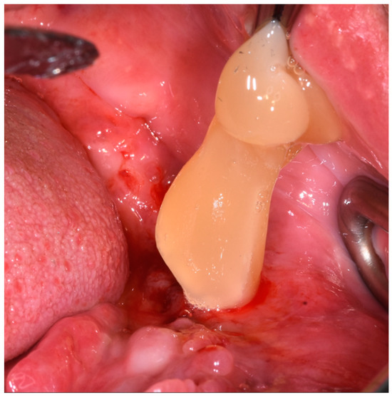 One month after the surgery (October 2021) the patient returned to the clinic and was subsequently rehabilitated with complete mandibular full removable dentures made by resin [31]. Due to the discontinuous presence of bone and soft tissue support in the residual mandibular jaw (Figure 7), the denture had very low retention and stability. Therefore, the patient wore the mandibular denture with reduced comfort and only used adhesive denture pastes to increase stability.